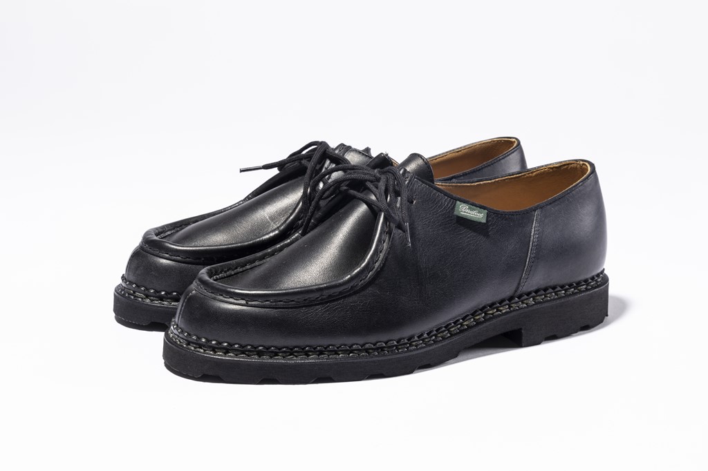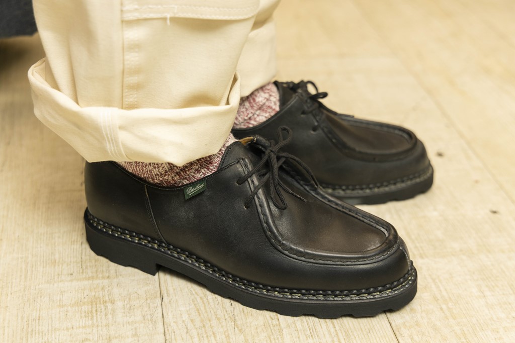ブランドの定番モデル「ミカエル」。アッパーに使用される革は、通称“リスレザー”と呼ばれ、防水性が高く劣化しづらい。そのマットな質感は、カジュアルながらも落ち着いた印象で、どんなスタイリングにも合わせやすい。重厚なラバーソール仕様で、実用性も抜群の一足。6万4350円