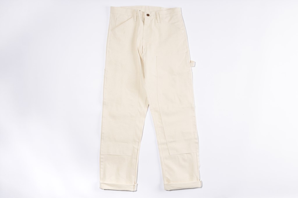 生地は、ナチュラルツイルを使用。ハンマーループやカンヌキ、三本針ステッチなど魅力的なワークディテールが満載の一本。ダブルニー仕様でワーク色は強いが、ややテーパードがかかりスッキリとした印象も併せ持つ。9990円