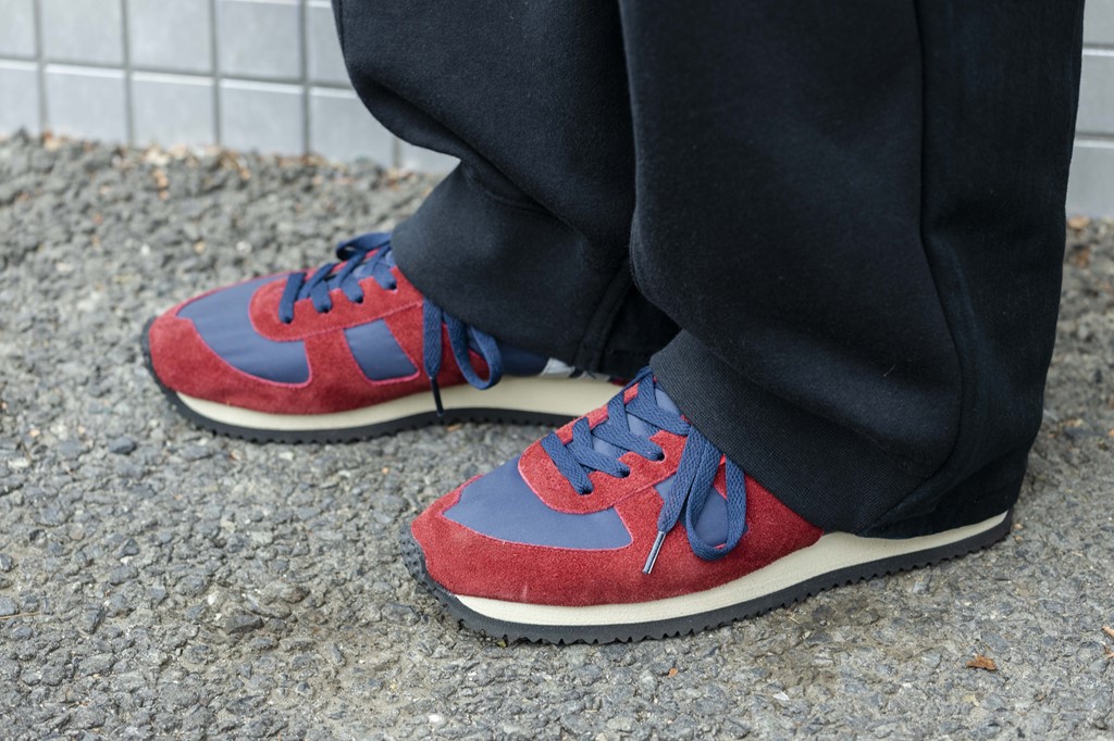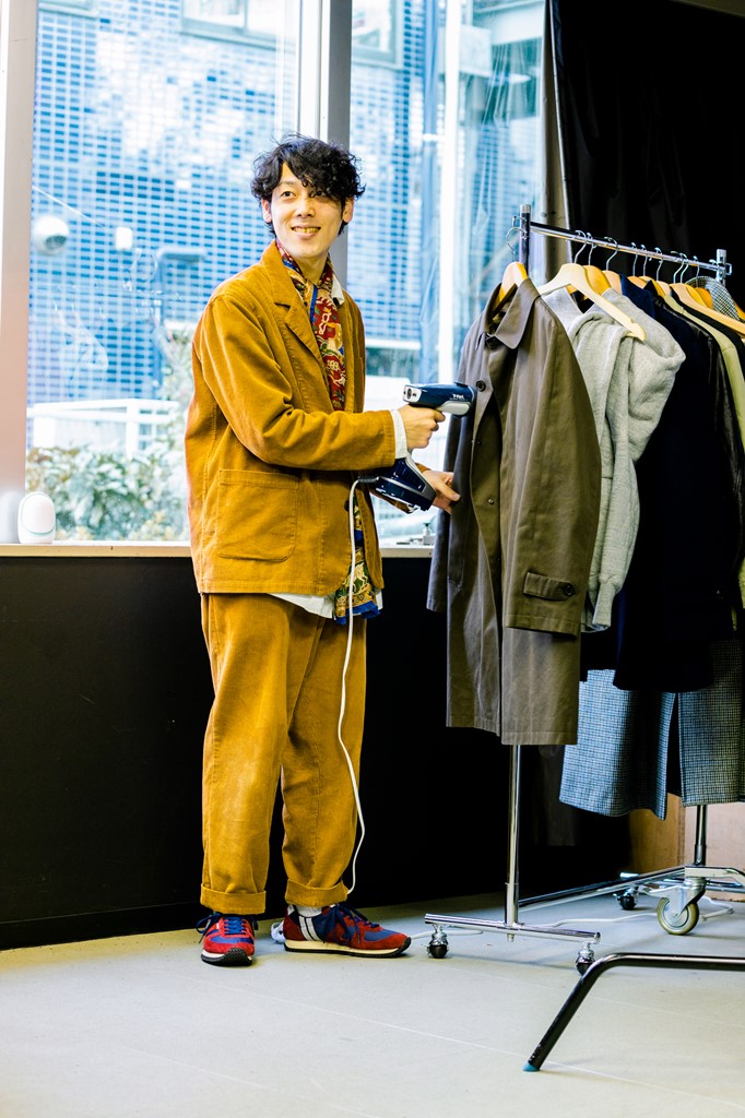 「スチーム掛けは、編集部の登竜門。多くの先輩方が現場にいる手前、なかなか座ってリラックスしづらいなか、長時間の立ち仕事でも疲れにくい履き心地の良さはすごく助かります。また、普段ボクがよく着る無地のアイテムとの相性が抜群で、足元にこれがあるだけで一気にファッション性が増すので、派手な配色でありながら意外と取り入れやすいなと感じました。」