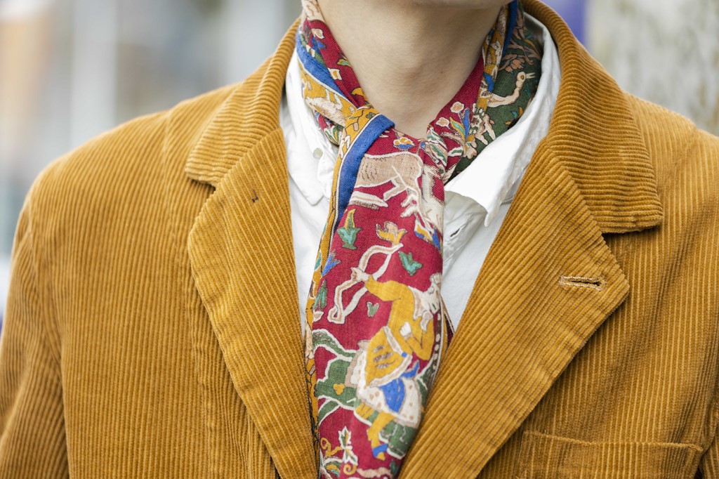 さらにパピーいわく、「首元のスカーフとの色合わせで、より上級な着こなしに見せている点もポイントです」とのこと。
