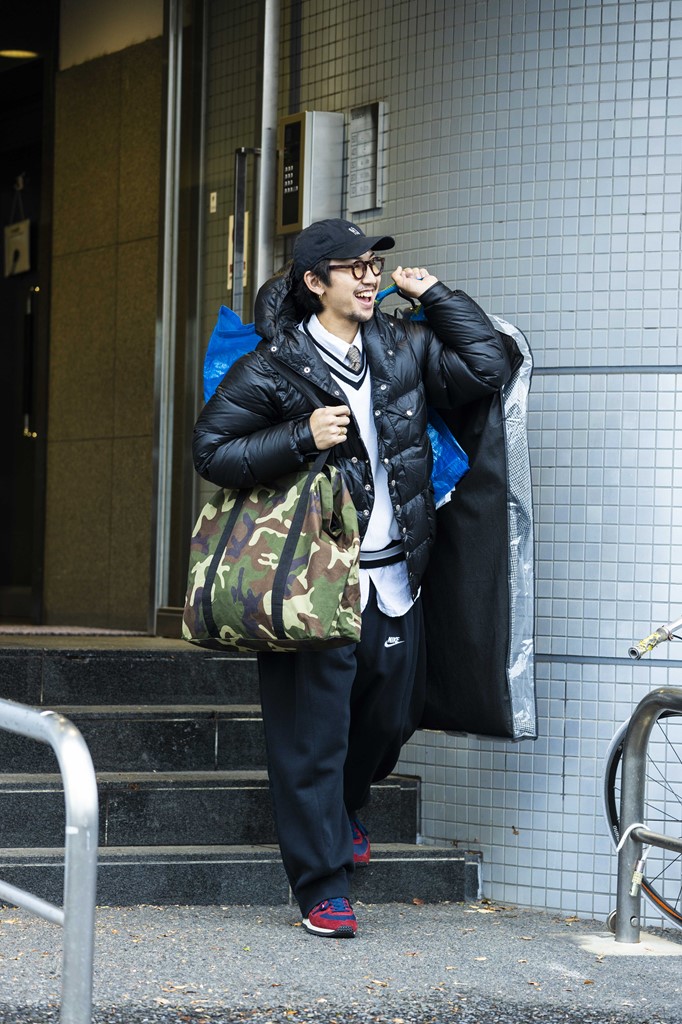 ダウンジャケットやスウェットパンツ、ベースボールキャップと、ド直球のスポーティなアイテムを盛り込んだコーディネイトに、インナーはトラッドスタイルで上品さをプラス。モノトーンに[カリフォルニー]の配色をアクセントとして効かせている。