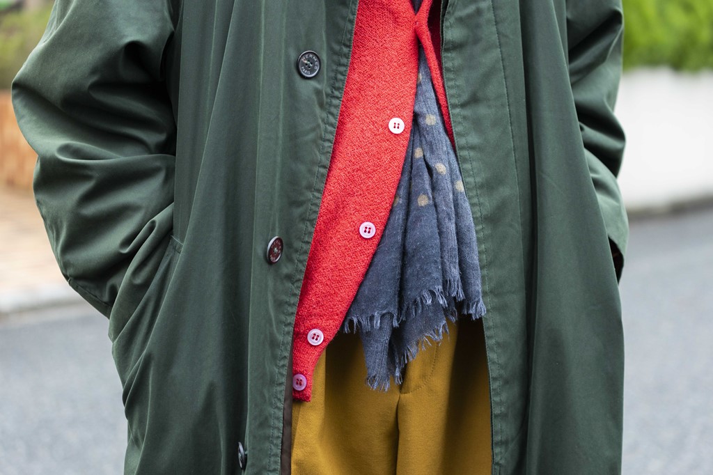 「レッドのカーディガンを色合わせとして取り入れています。このように上品なヨーロッパ風コーディネイトにもハマるのは、パトリックがフランス生まれらしい洗練された雰囲気を持っているからなんでしょうね。」