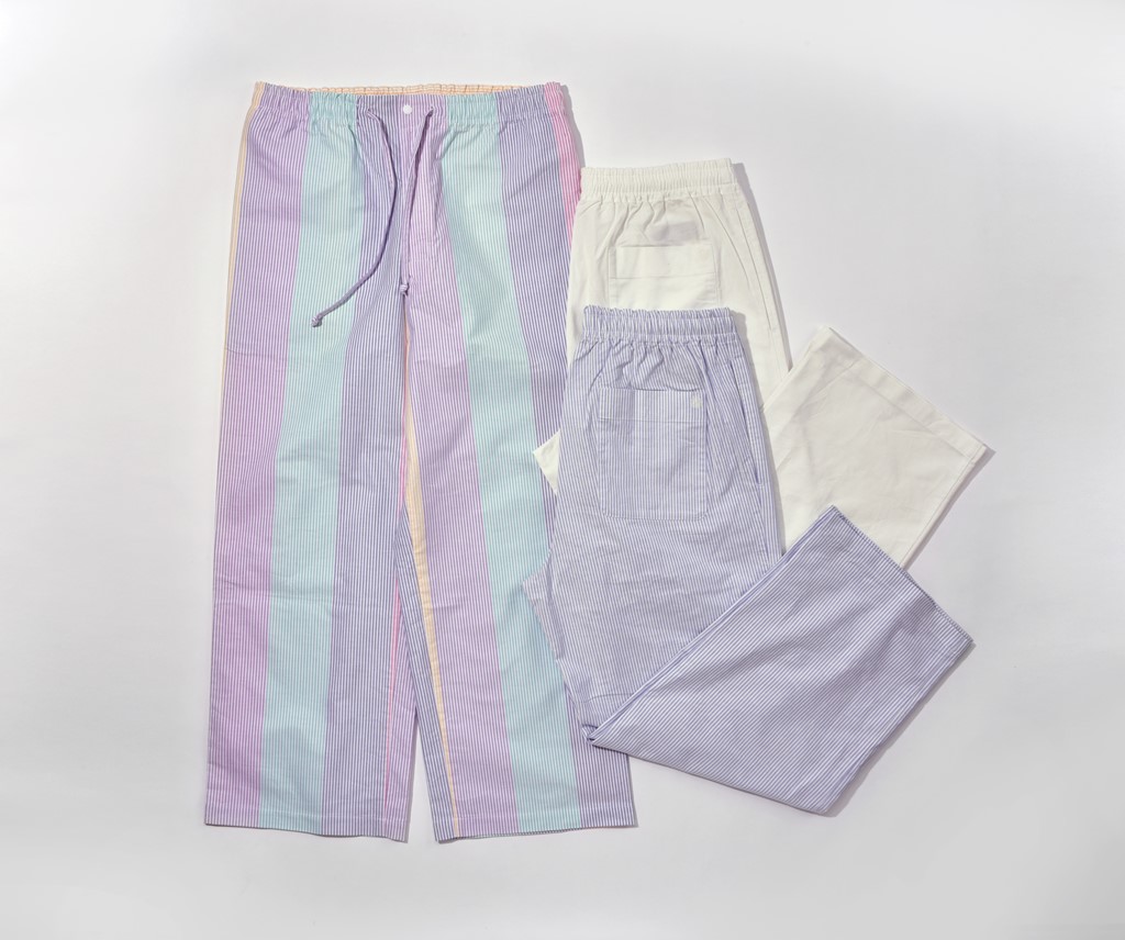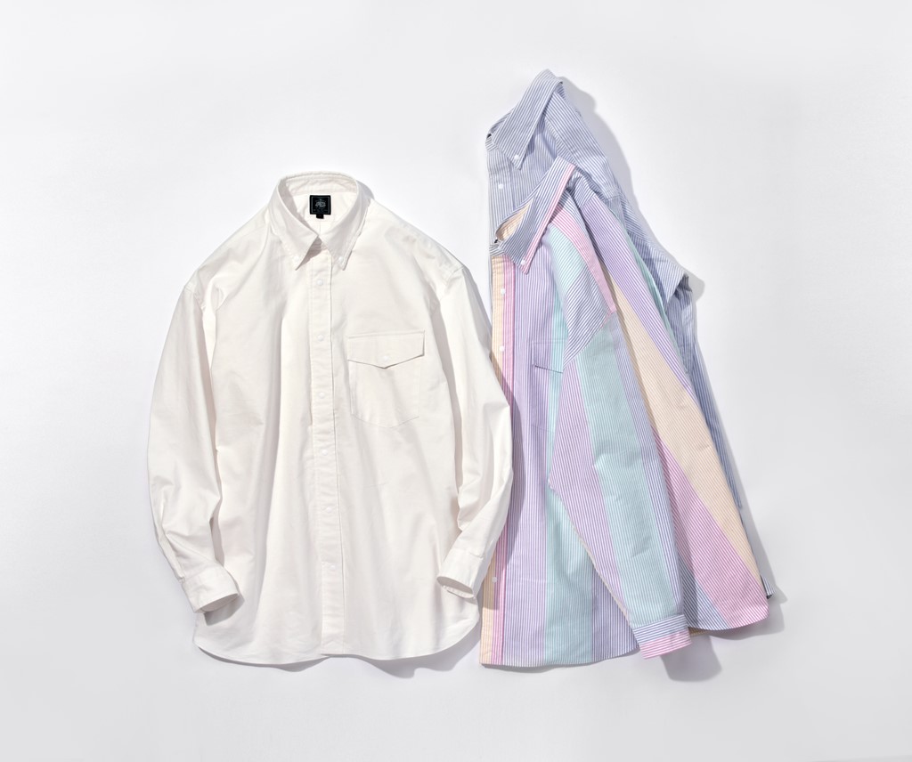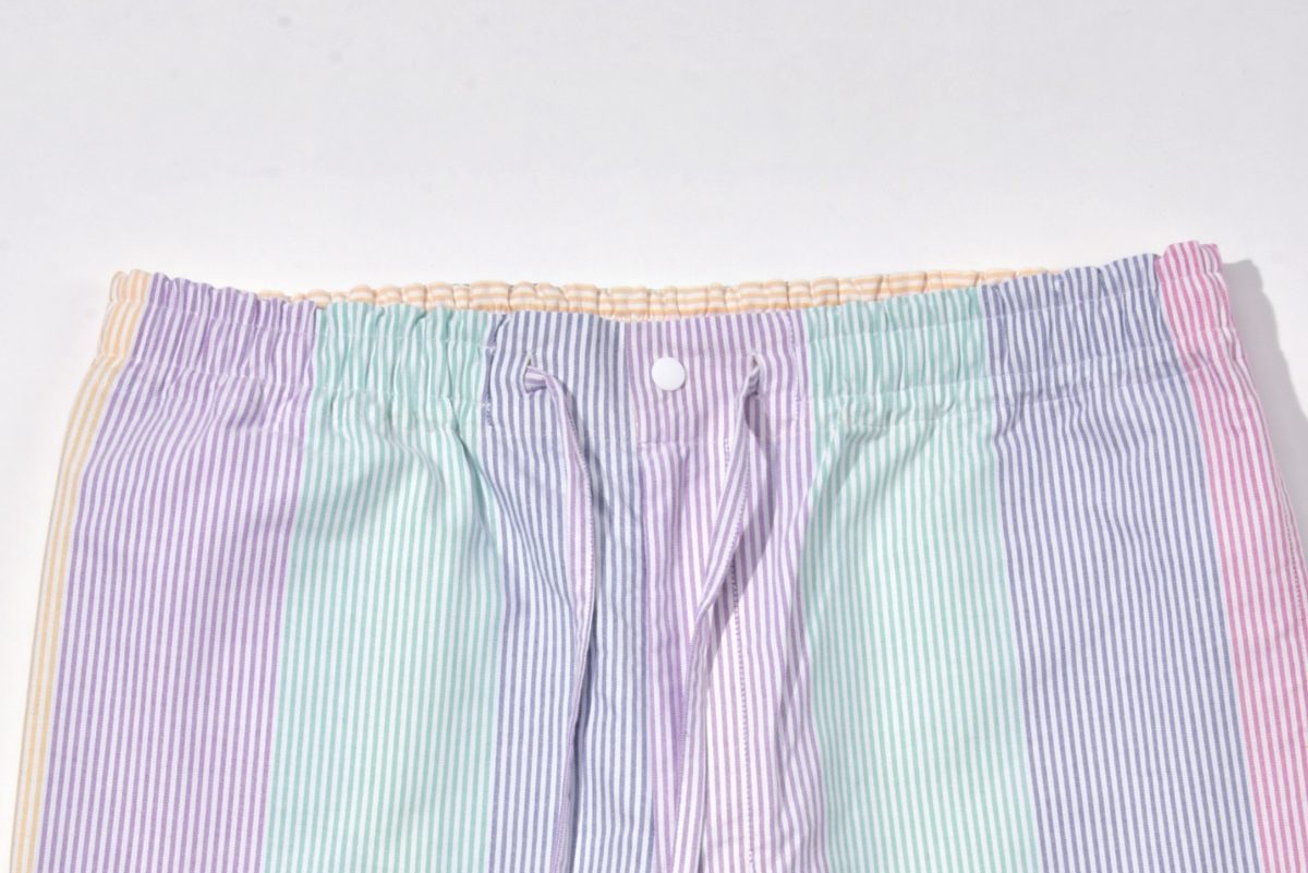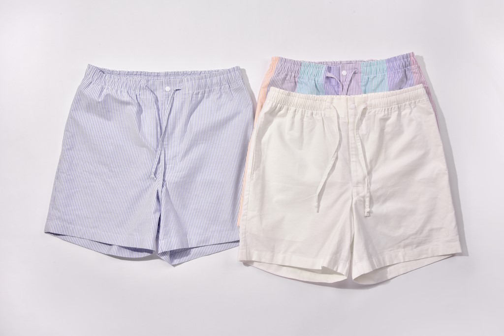 ルーズシルエットに仕立てているJ.プレス オリジナルスの定番[バギーフィットB.D. シャツ]を、より肩の力を抜いて着用できるようスナップボタンで制作。さらにはセットアップで着用可能なリラックスパンツとボードショーツの2型も同様の生地で作っていただきました。ありそうでなかったオックスフォード生地のボトムスは新鮮なのにクラシックな雰囲気です。全3型ともに、ホワイト・ブルーストライプ・マルチストライプの全3色、M・Lの2サイズでの展開となります。