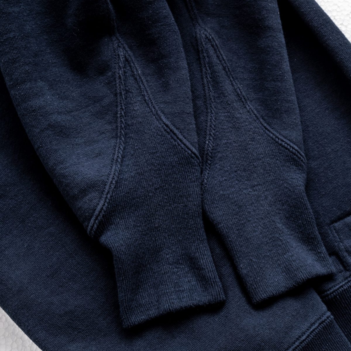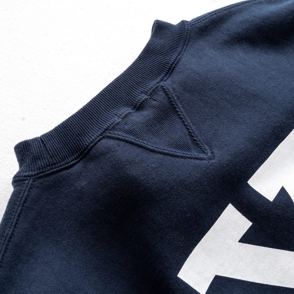 ベースとなったのは1920年代よりA.G.スポルディング&ブロスが展開していた両Vスウェットがベース。一見、1950年代以前に主流だった両Vスウェットだが、袖リブが首元のガゼットのように、V字に切り込まれた形状(ガゼットスリーブ)となっている。リブの伸縮性が乏しかったスウェット黎明期に創意工夫を凝らして編み出された機能美と言えるデザインだ。