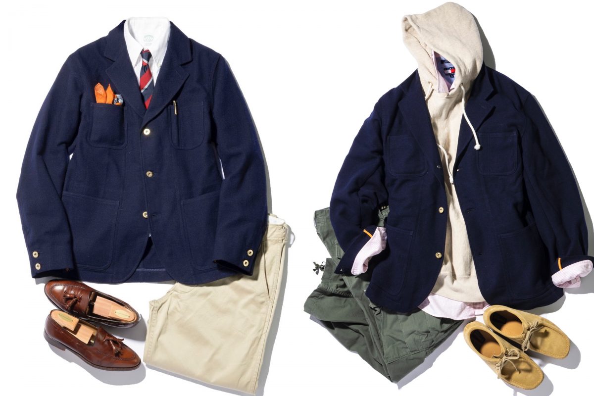 まさにそこが別注のミソ! 「ユニバーサルオーバーオール」が培ってきた本物のワークテイストをふんだんに取り入れることで、紺ブレ史上最もカジュアルで着回しやすい一着が誕生したのである。