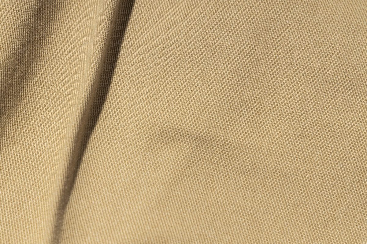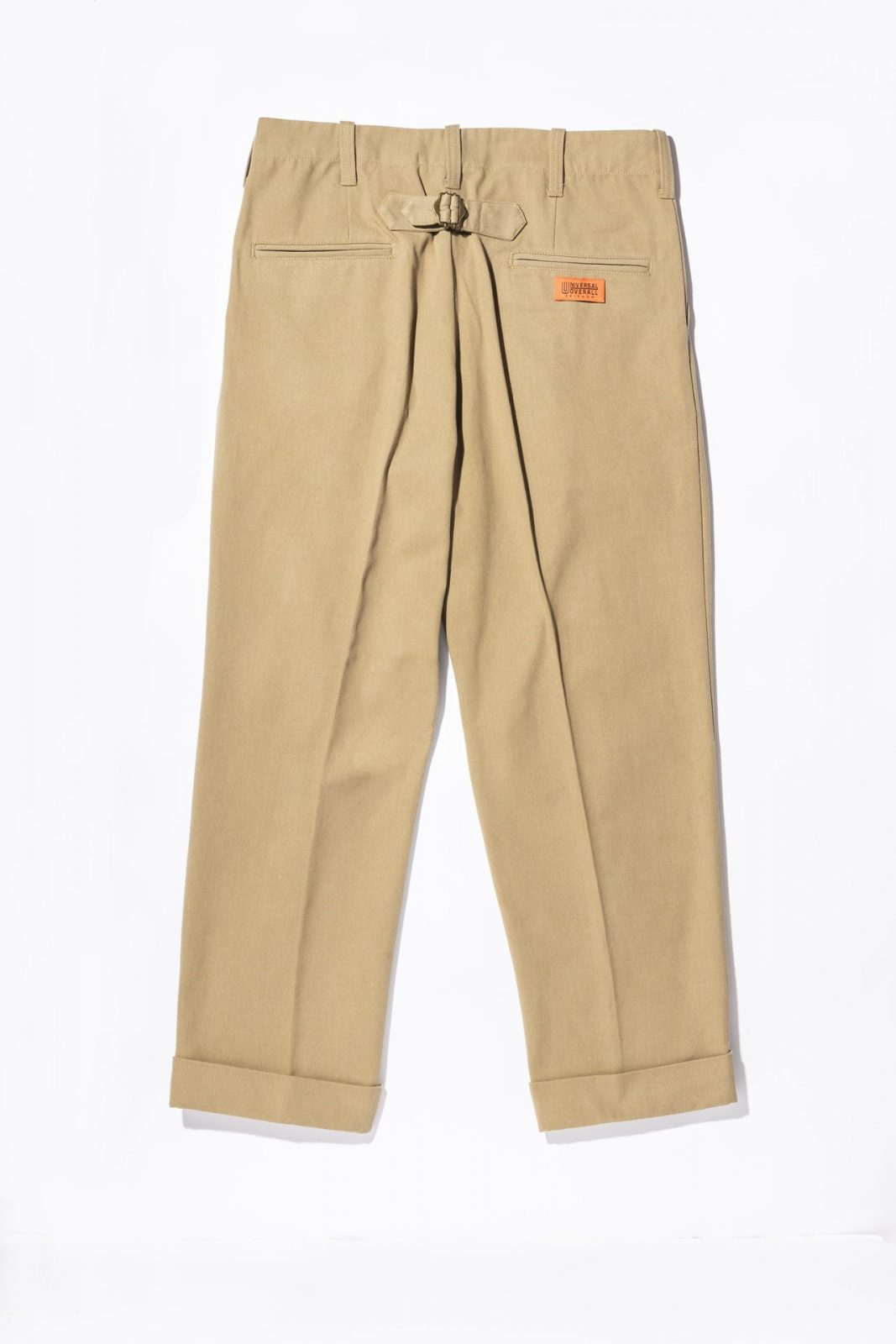 ドーナツボタンやシンチバックなどのワーク要素を盛り込みつつ、旬な2タックテーパードシルエットに。素材はコットンとポリエステルの混率を変え、限りなくコットン見えする通称“逆転TC”を採用した。