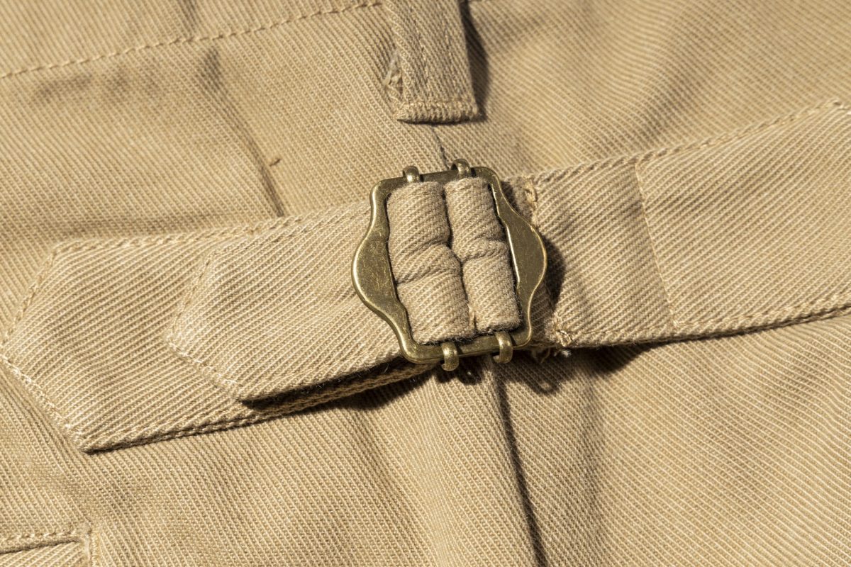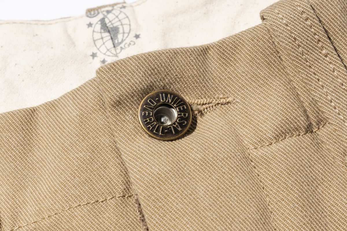 ウエストのトップボタンはワークウエアの象徴的なパーツであるドーナツボタンに変更。