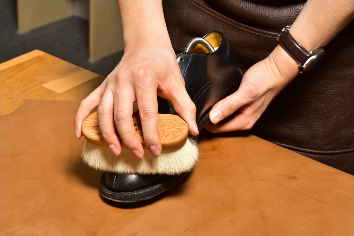 跡が付かないよう、柔らかなフィニッシャーブラシでブラッシング。白く濁っている部分をクリアにしていくイメージで。保管にはシューツリーが必須だ。