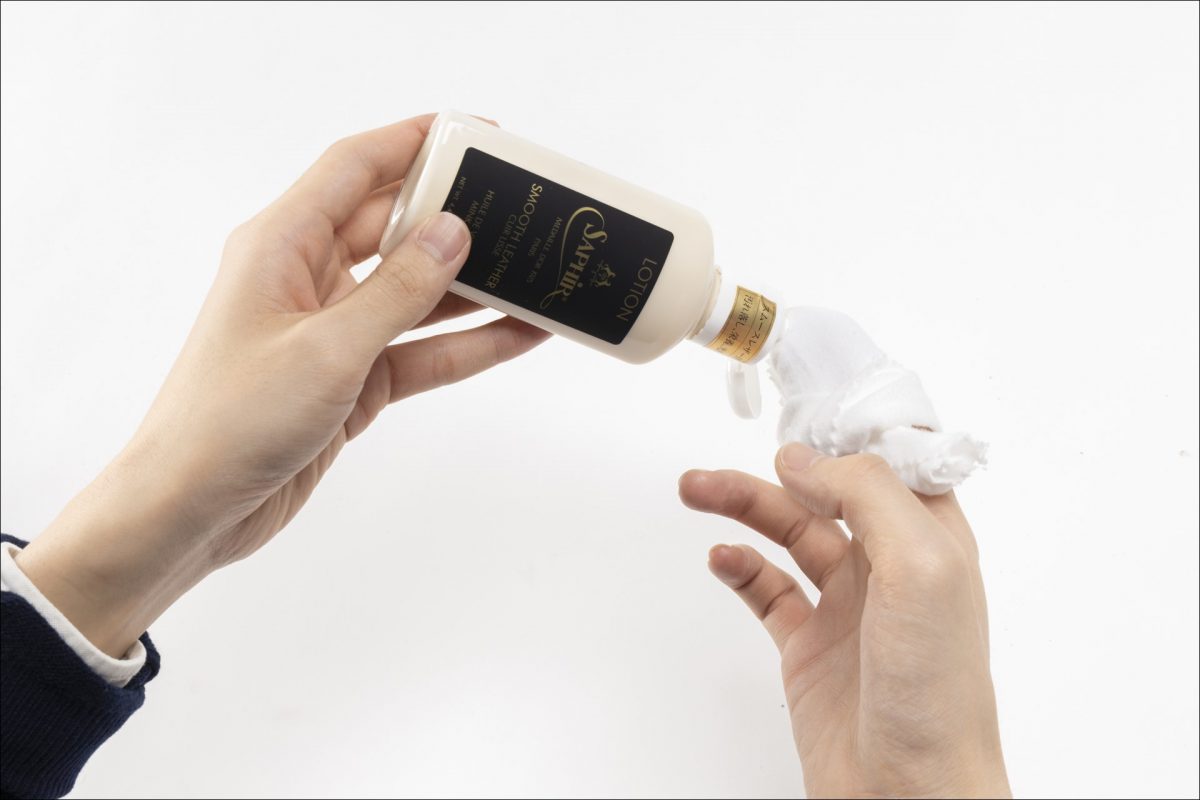 クロスではなく指で専用クリームを塗り込んでいく。アプライブラシなどを使うと、毛羽立ちが起きてしまう可能性があるので注意。力を入れず、優しく擦り込むイメージで。今回のメインとなる重要な工程なので、時間をかけて丁寧に行おう。