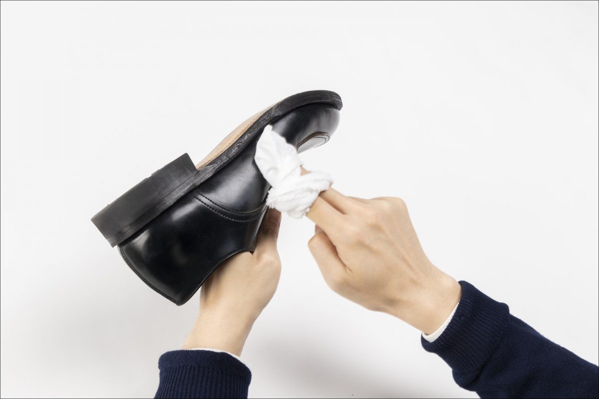 クロスの綺麗な面を使って乾拭きして終了。少なくともその日履いた靴は、帰宅後にこのケアだけでも欠かさないようにしよう。