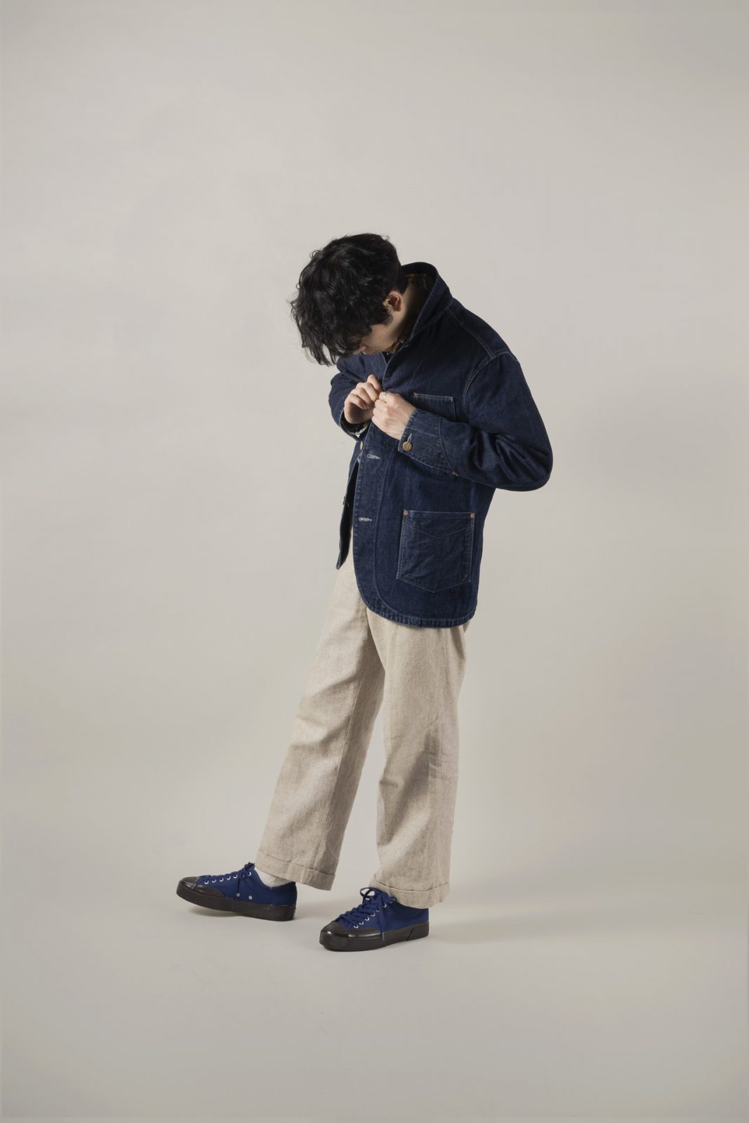 ワークウエアと言えば真っ先に思い浮かぶデニムカバーオールを取り入れたコーディネイト。重厚な“ロイヤルブルー”カラーは、アクセントとして使うもよし、パピーのコーデのようにネイビー系でまとめてもよし。一見合わせづらそうだが、その汎用性は意外にも高い。