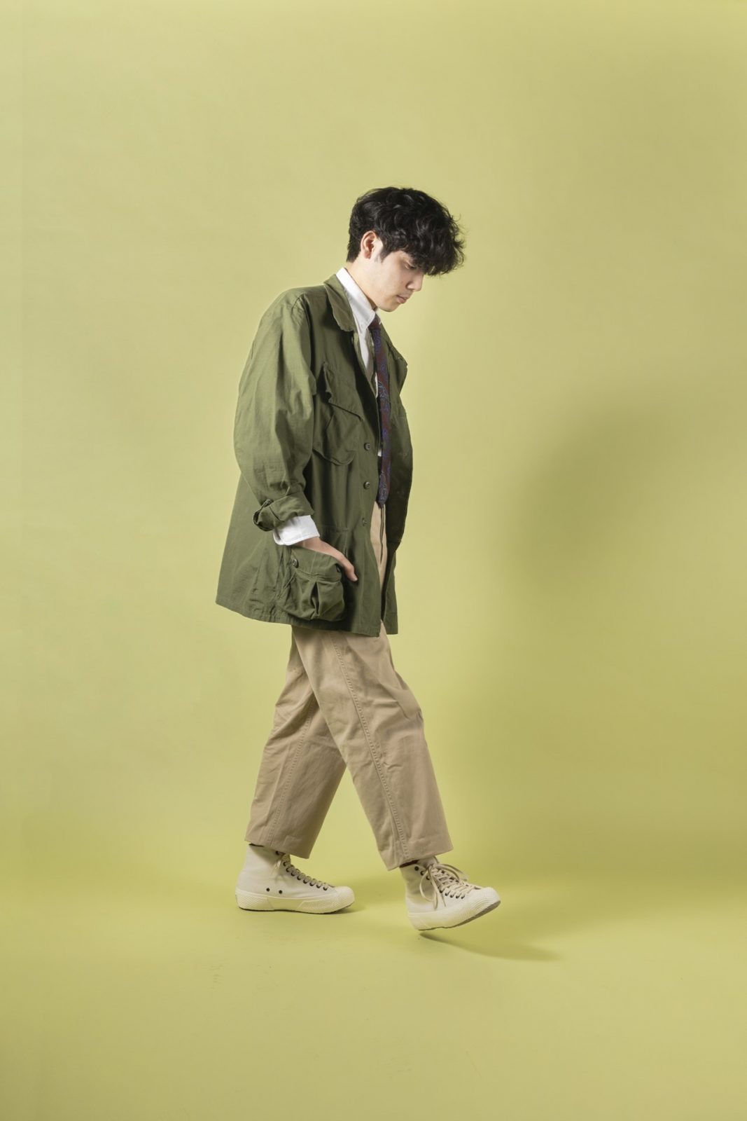 編集部パピーの私物を使用した、等身大コーディネイトをお披露目。「ミルスペック」というカテゴリテーマにもとづいて、ジャングルファティーグジャケットやチノパンを取り入れてみた。カラーソックスをパンツの裾からチラ見せすれば、足元の存在感をより強調できる(さらに、厚手のソックスを弛ませて履くのがパピー好み)。夏はぜひショーツと合わせたい!
