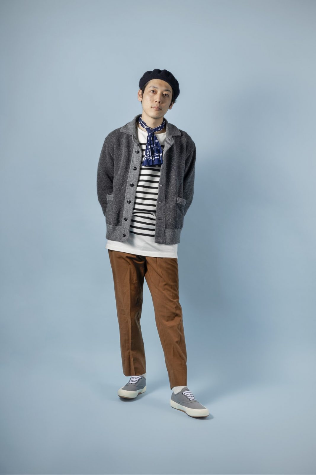 「ミルスペック」「ワークス」に比べて、ポジティブな意味で重厚な雰囲気が少ないため、上品さのあるコーディネイトに向く。「デック」というテーマどおり、ベレーやバスクシャツでマリン感を演出。スペルガを含む、ヨーロッパらしいエレガンスを随所に盛り込んだ“大人のラフな休日”コーデだ。