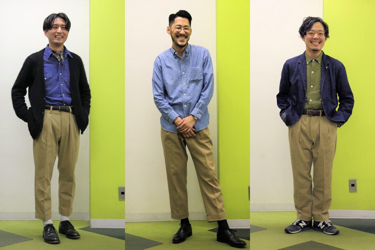 そして、我が2ndの営業チーム3人。ジャケットや革靴、スカーフなど、仕事柄トラッドやドレス要素の強いスタイリングだが、こだわりの流麗テーパードシルエットで上品に着こなすことができる。