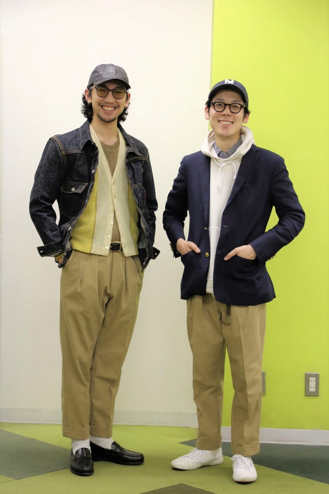 まずはセカンド編集部きっての服道楽のアンジー(左)とパピー(右)がレッツトライ! アンジーはワンウォッシュの濃紺デニムジャケットに‘60年代のニットカーディガンを合わせたヴィンテージスタイル。パピーはスウェットパーカにネイビーブレザーを合わせた休日トラッドの王道スタイル。