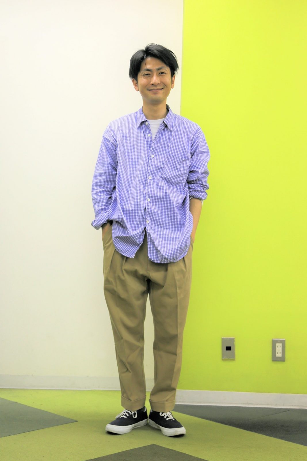 お次は、本誌でお世話になっているスタイリストの吉村祥吾さんがたまたま打合せで会社にいたところをキャッチ。シャツ一枚のシンプルなコーディネイトにも、タック入りのパンツが程よく主張して、あっさりなりすぎないのがGOOD!