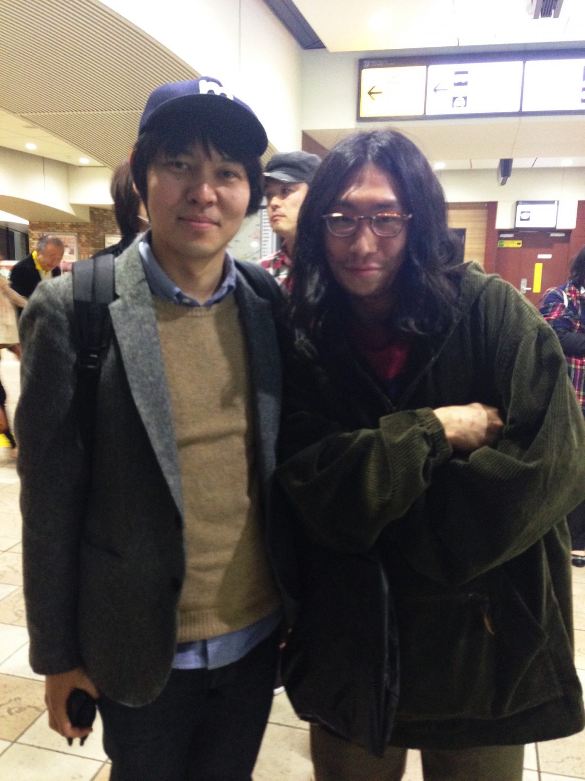 サーフィンからアヴァンギャルドまでをモットーに、昨年20周年を迎えた吉祥寺店を切り盛りする矢島さんと当時週2くらいでノホホンとバイトしていた不気味くん。写真は2014年4月。再開発の途中だったJR吉祥寺駅にて。