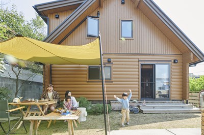 金子邸、庭の様子。なんとBBQ用のキッチン付き。自然と笑顔になってしまうログハウスだ