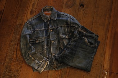 「ウエアハウス」のプレス、藤木さんの私物。Gジャンは高校生の時に買った初めてのヴィンテージ。パンツは1930年代のレディスデニムをメンズ用としてウエアハウスが製作したモデル、[70201XX]