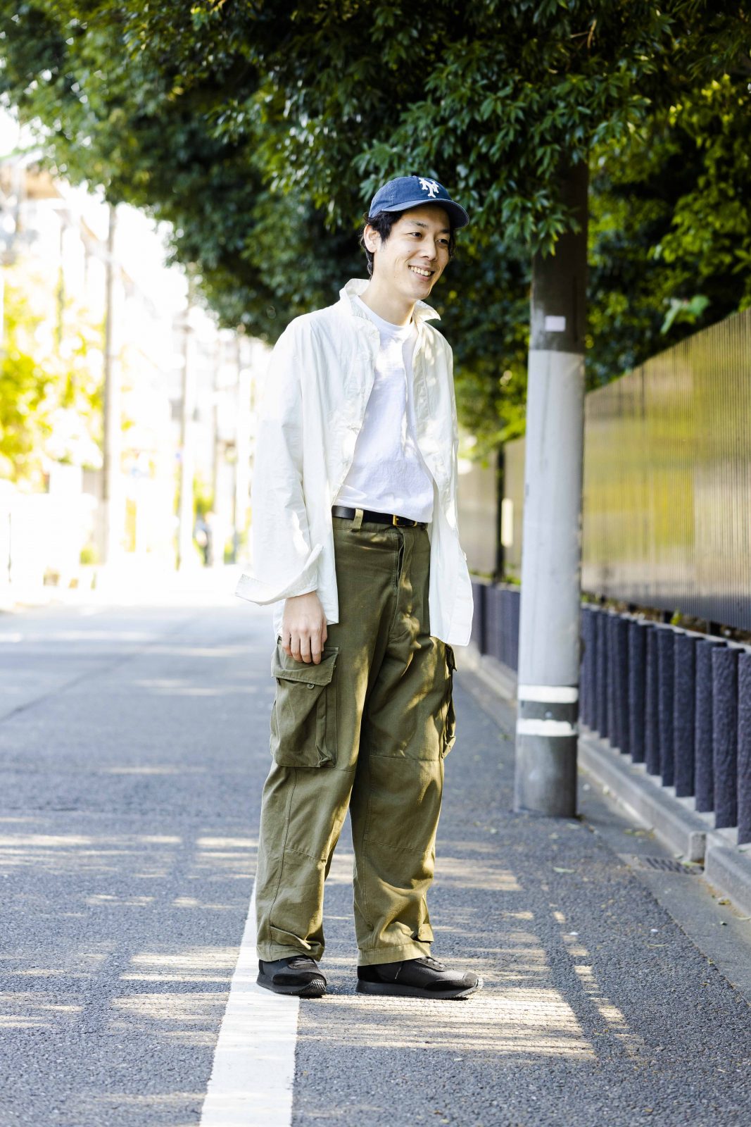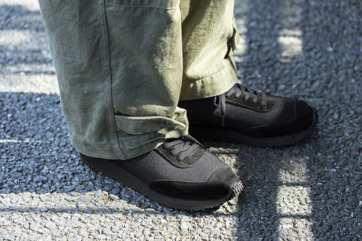 シンプルがゆえ、どんなスタイリングにも取り入れやすい[トルネード17]だが、今の気分で履くならミリタリーパンツを。裾幅広めでゆとりあるシルエットのパンツを、ややシューズが隠れるハーフクッションぐらいの丈感で合わせたい。ことブラックに関しては、ソールまで同一色で統一されているため、グッとコーディネイト全体が引き締まるはずだ。