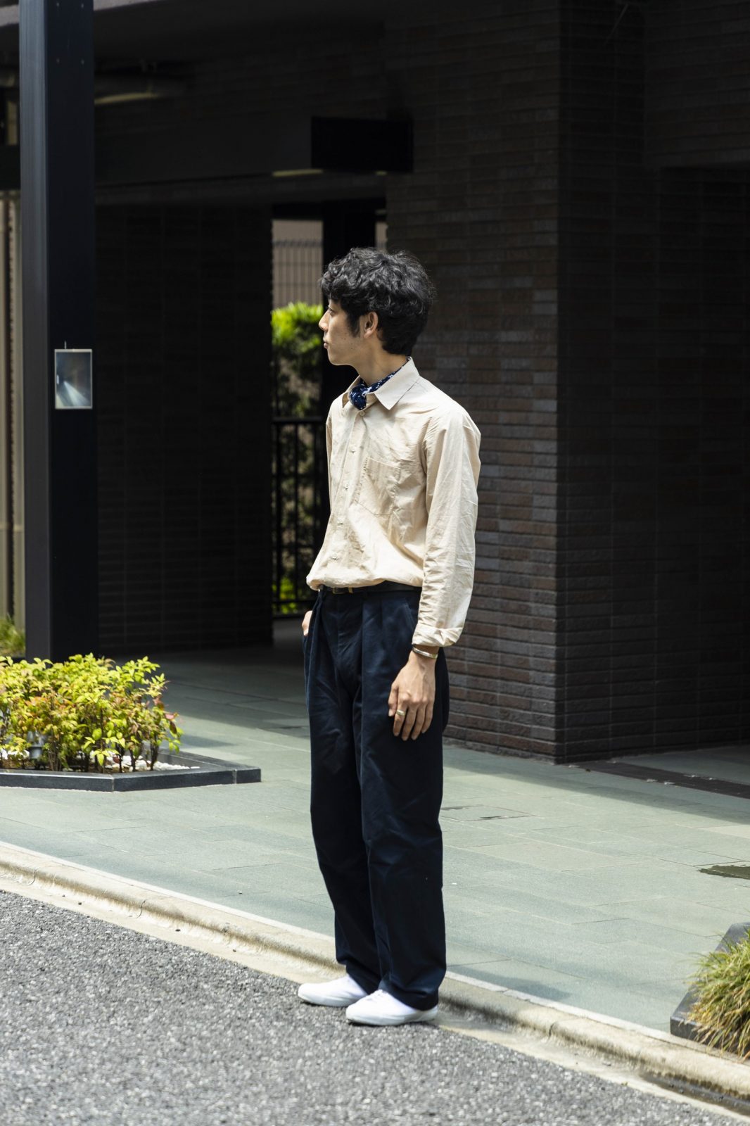 編集部パピー高野によるスタイリングがこちら。革靴だとどうしてもカッチリしすぎてしまうところを、足元に[ヌード]を合わせることでいいバランスに仕上がっている。かといって、もっとカジュアルなホワイトスニーカーを選んでしまうと、ここまでのまとまりは生まれない。シルエットが細くスマートになり、要素を削ぎ落した[ヌード]だからこそ醸し出せる雰囲気なのだ。
