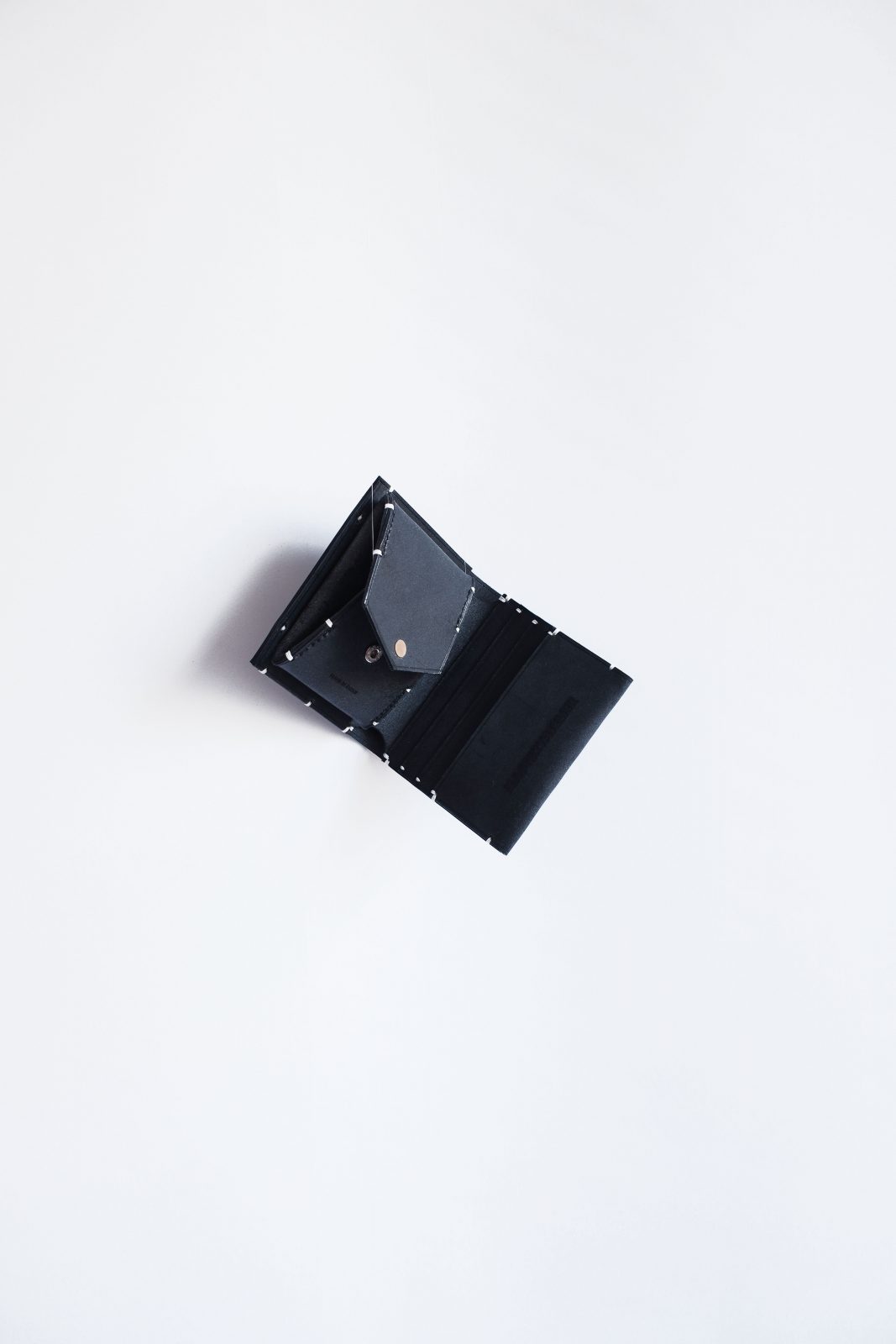 100%手作業でサドルステッチを施しており、縁にはバーニッシュ加工、デボス加工が施されている。オリジナルのデザイン、手仕事による特徴的なディテールが魅力。 色:黒/素材 : 日本製フルグレインワックスレザー/金具 : 真鍮 イタリア製/ステッチ : フランス FIL AU CHINOIS 蝋リネン/機能:カードポケット 4枚、お札、コイン/日本製。42,000円。