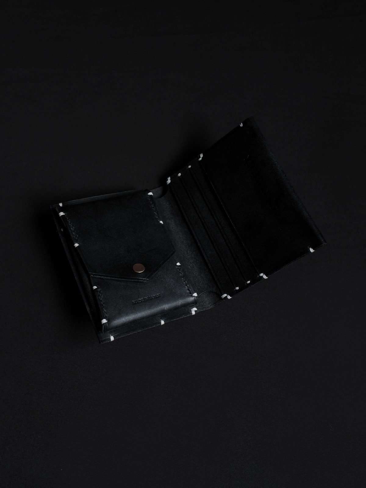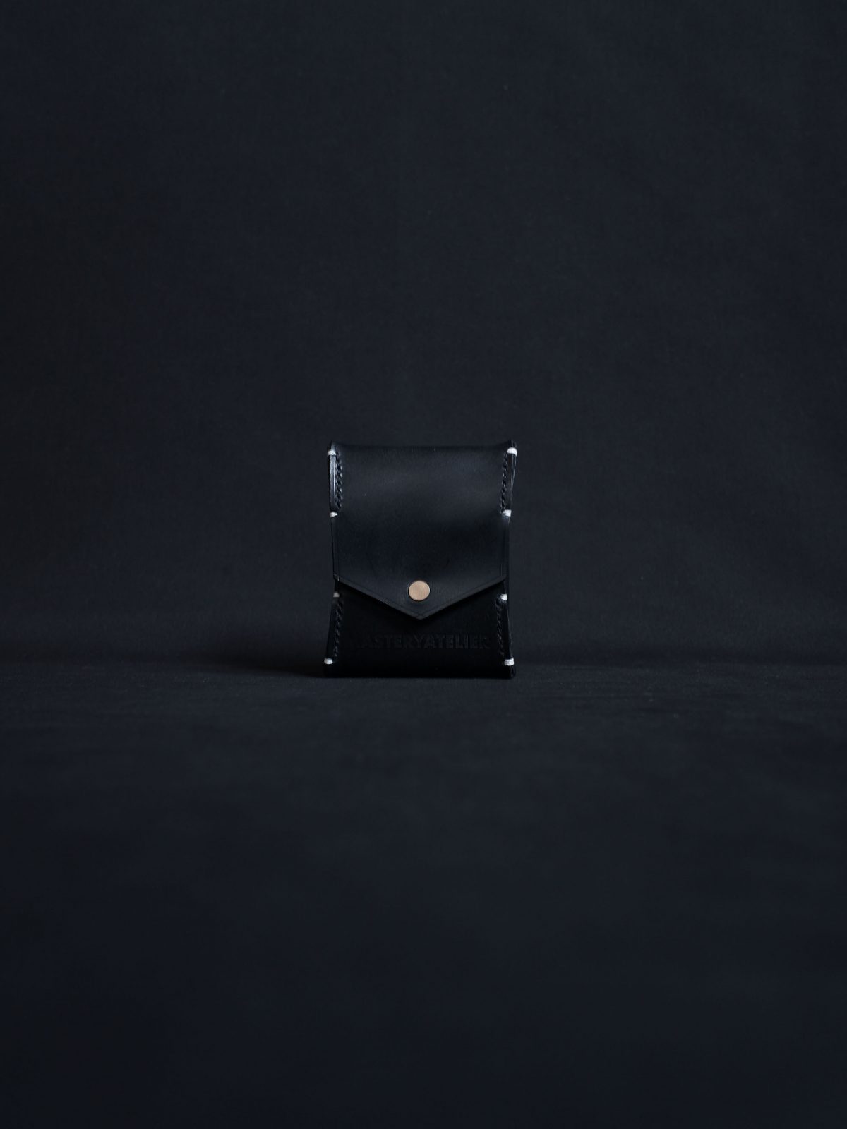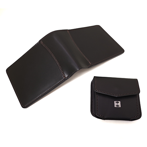 仕様は上の財布と同様。使い勝手の良い小銭入れ。色:黒/素材 : 日本製フルグレインワックスレザー/金具 : 真鍮 イタリア製/ステッチ : フランス FIL AU CHINOIS 蝋リネン/機能:カードポケット 8枚、お札、コイン/日本製。16,000円。