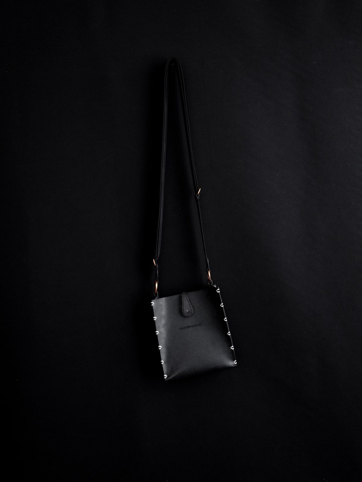 仕様は上の2つと同じ。ハンドペイントが施されている。現代的で洗練されたこの小さなバッグは、装いを格上げしてくれること間違いなし。 色:黒/素材 : 日本製フルグレインワックスレザー/金具 : 真鍮 日本製/ステッチ : フランス FIL AU CHINOIS 蝋リネン/機能:毎日のアイテムをすべて収納/日本製。80,000円。