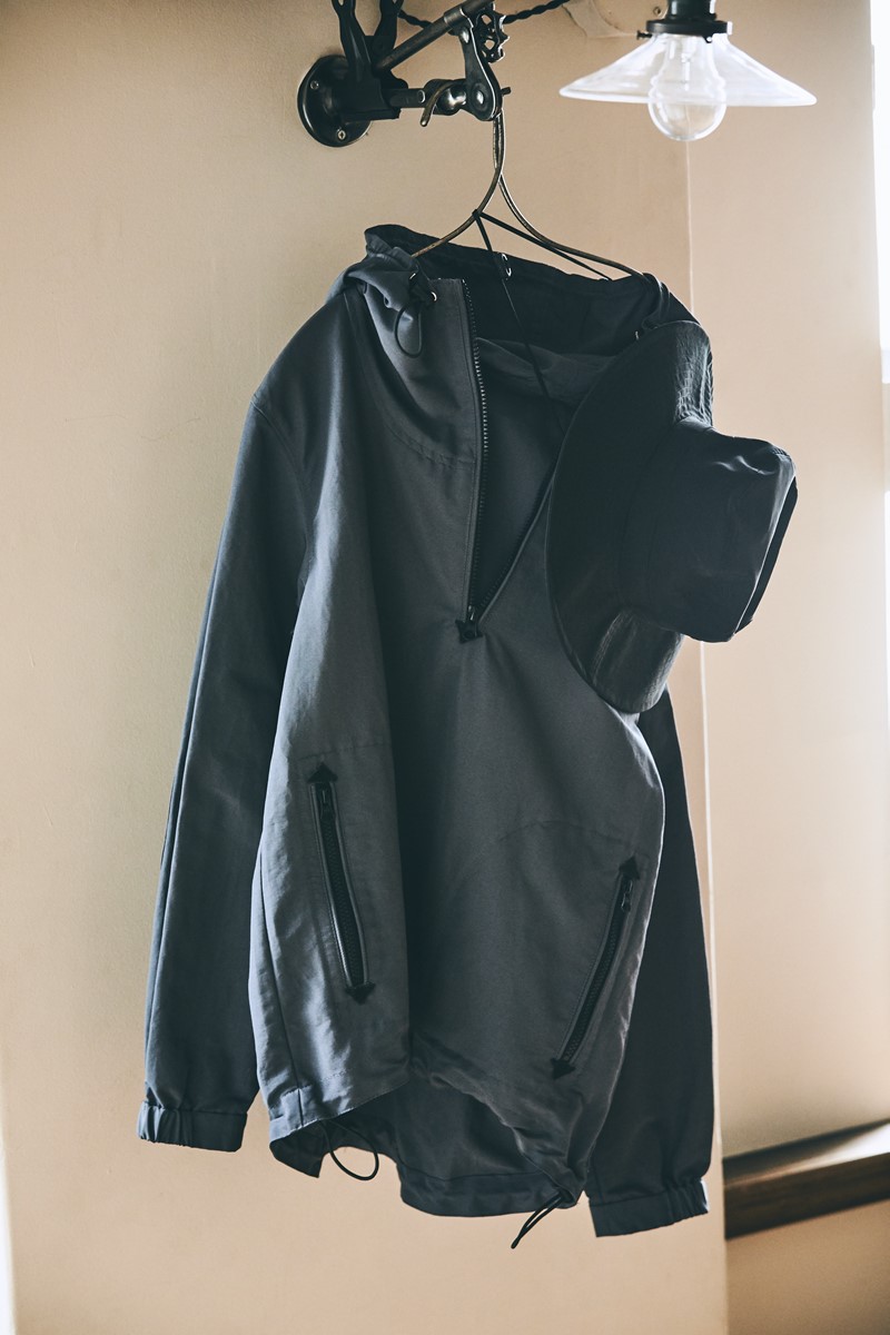 撥水機能を備えたパッカブル仕様のアノラックは、前後で着丈の違う個性派。ハットもロクヨン。アノラック2万8800円+税、ハット8800円+税(マッハ55 リミテッド☎03-5413-5530)