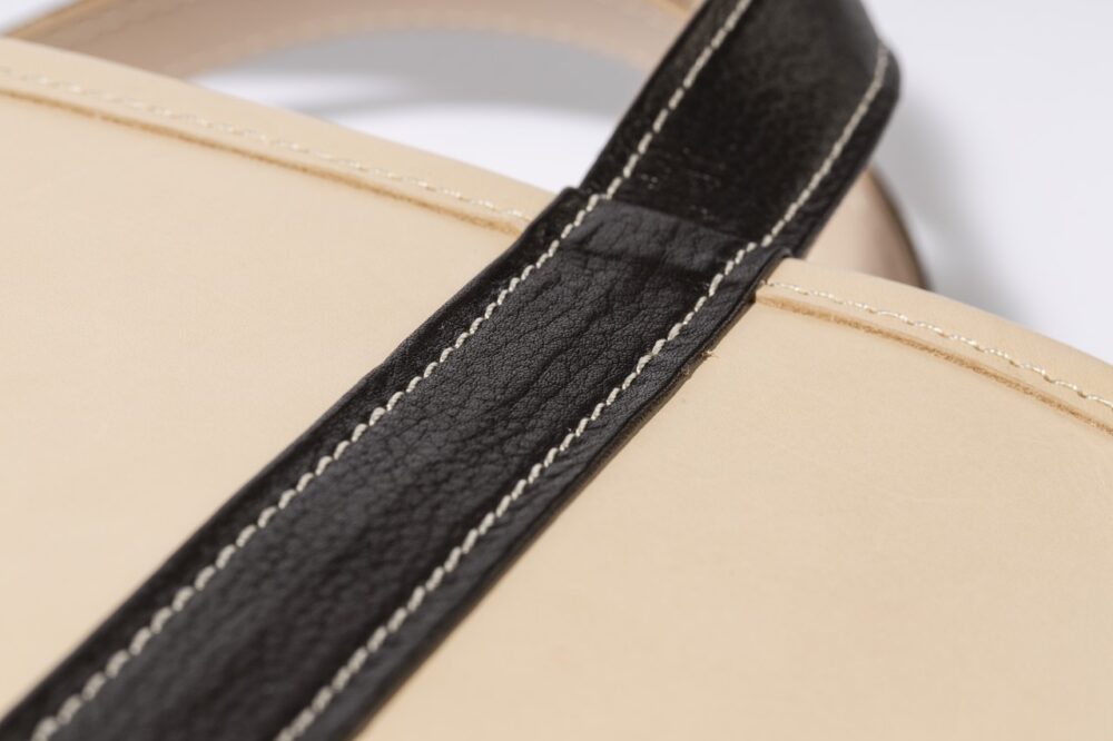シンプルなデザインなだけに、決め手はレザー選び。あまり重くならないよう、一枚革で成立するように選んだのはフルタンニンレザーのヌメ革。顔料などを施す革とは違い、一切塗膜するものがないため、レザー本来の繊細で滑らかな銀面が味わえる。さらに経年変化も楽しめるので、これから使い込んで飴色に変わっていくのだ。