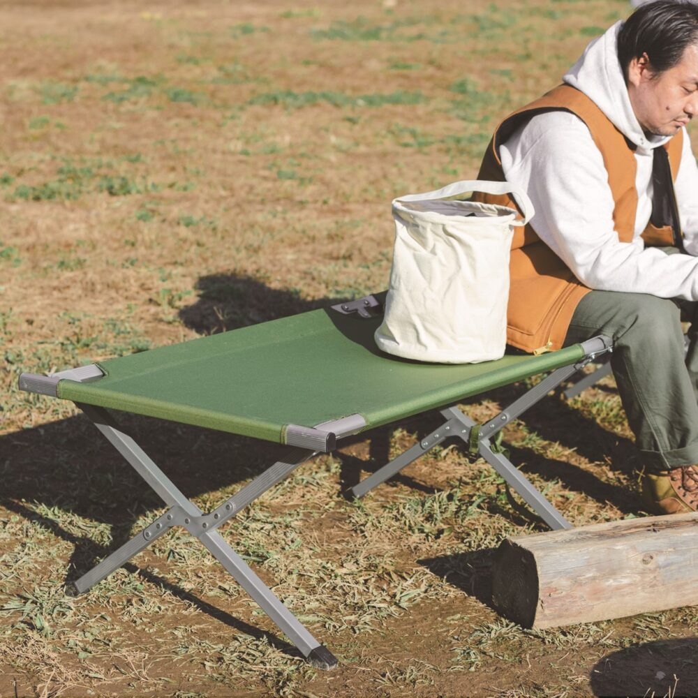 長さ190㎝で大人もゆったり寝れるサイズの折り畳み式簡易ベッド。シート部分は600デニールのタフなポリエステル素材。キャンプシーンでは棚やベンチとして重宝する。1万3200円