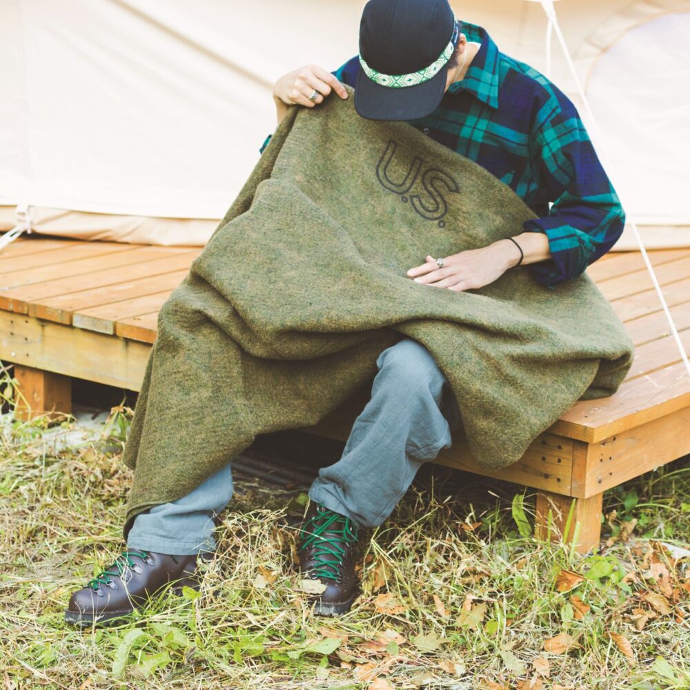 203×157㎝の大型ブランケットはヴァージンウール70%配合でタフながら肌触りも良好。ミリタリーテイストでルックスもよく、難燃素材で火のそばで使えるのもありがたい。5720円