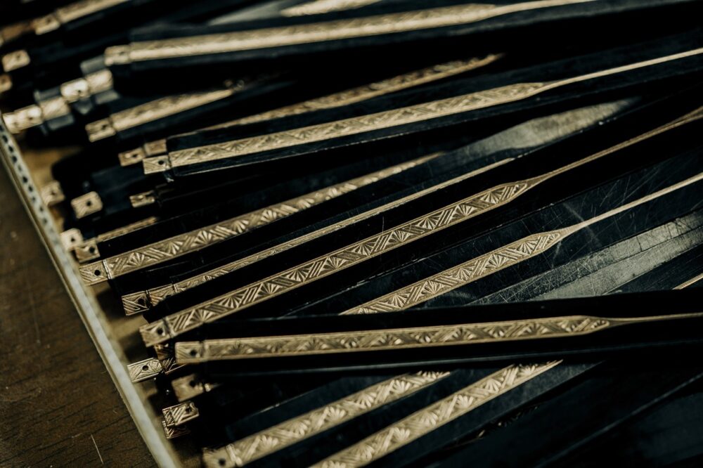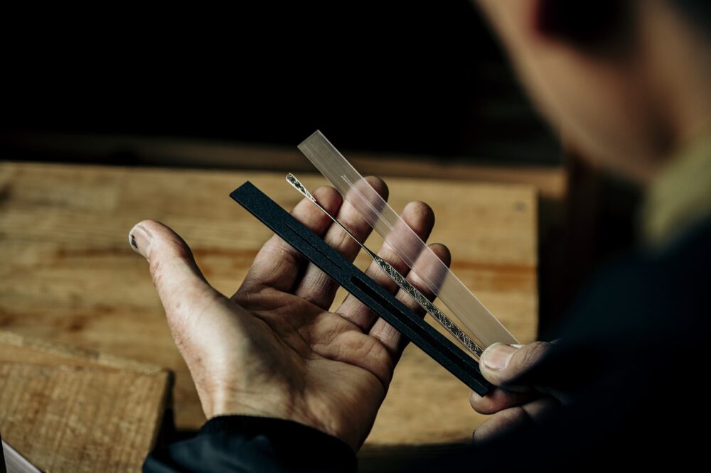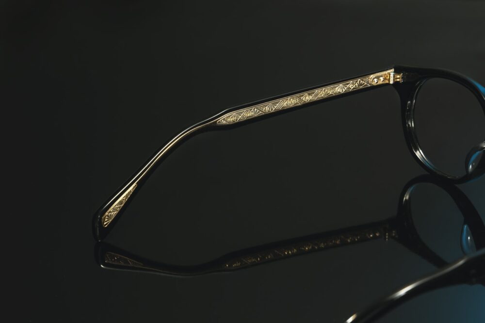 これは現在ではほぼ行われていないつくり方で、専門とする職人は鯖江で活動する藤田睦さんただひとり。彼がひとつひとつ丁寧に貼り合わせたテンプルは一切の継ぎ目も見られず、芯に刻まれた美しい彫金模様を引き立てる。