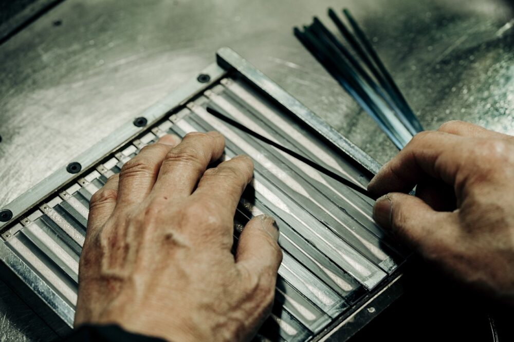 通常のメガネは、テンプルの形をした樹脂板に金属の芯棒を差し込む“シューティング”という技法で製作される。一方“芯張り” は、樹脂板2枚で金属芯を挟みこむ手法。
