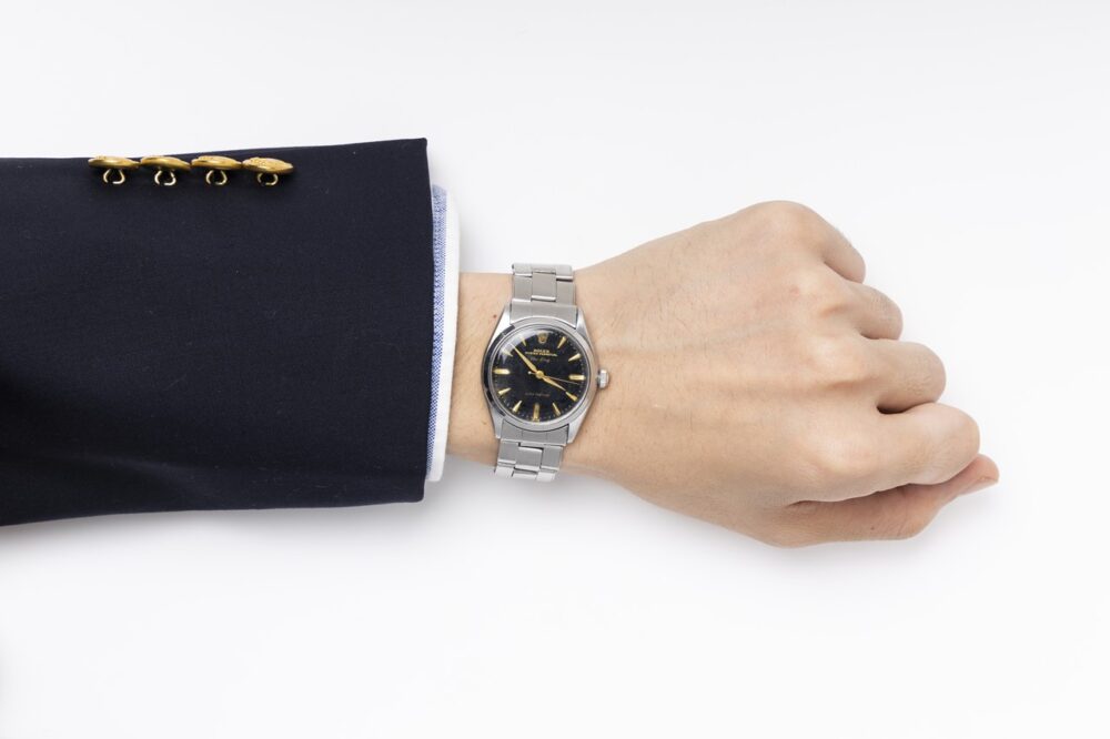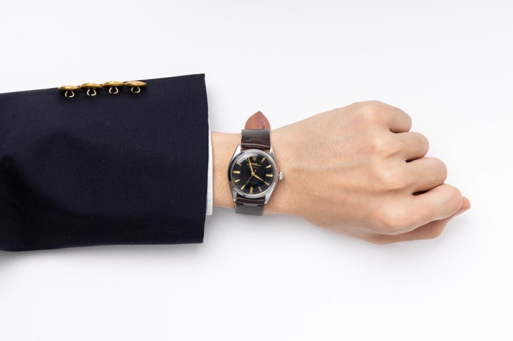 2ndスタッフが愛用しているヴィンテージ時計をコードバンベルトに変更。オリジナルのステンレスベルトだと、休日スタイルには、やや硬い印象だが、コードバンベルトだと、程よくカジュアルに。