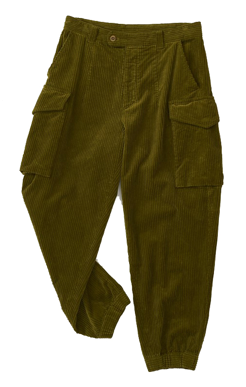 華美すぎないカラーコーデュロイで上品な印象に仕上げたミリタリーカーゴパンツ。足首のリブもア クセント。3万7400円