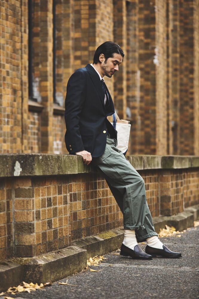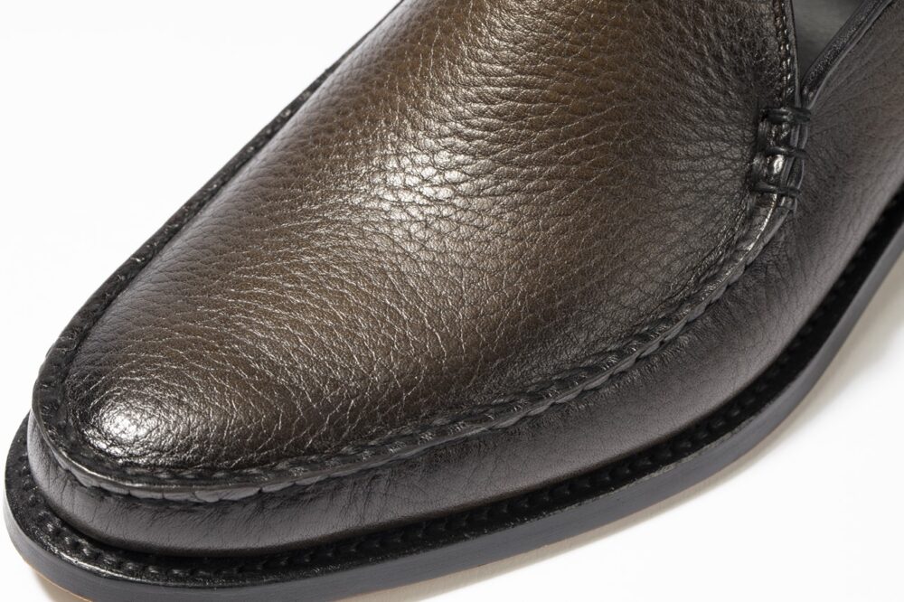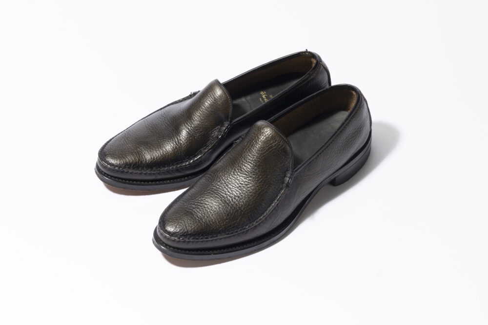 コインローファーよりもシャープで優美なシルエットは、品のいいブレザースタイルと間違いなく相性がいい。ローファータイプのため、春夏にはカジュアルに素足で合わせるプレッピーな装いにも、ひと役買ってくれる。光の加減でブラックにもブラウンにもオリーブにも見える色味はコーデを選ばない。