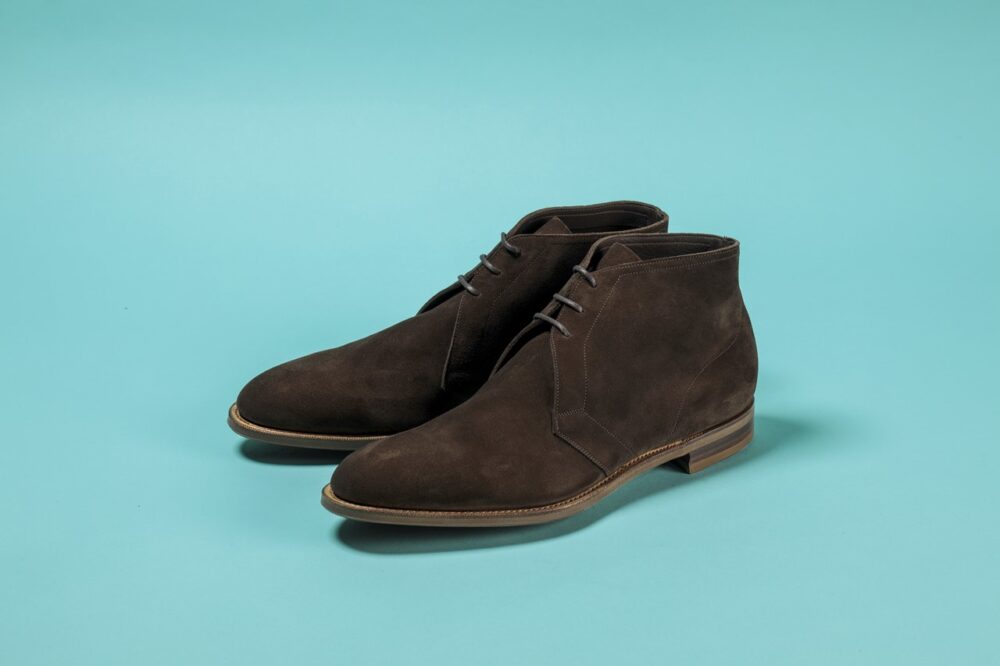 「スウェードのチャッカはマストアイテム。グッドイヤーながら快適で、アンライニング仕様で履き心地がよく、ラバーソールで雨でも履けます」14万9600円