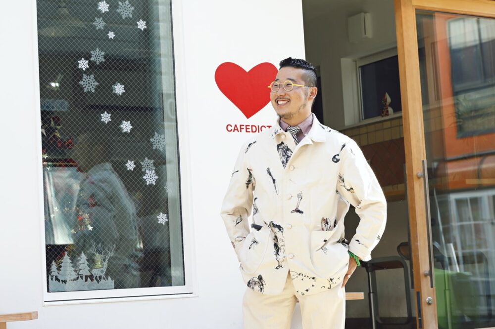 今年に松陰神社前でカフェディクトをオープン。大の野球狂でもある、インパクト大のジャケットで表れた表参道になる人気店「ホームディクト」プレイングマネージャー・NAOさん。よく見ると食にまつわるアートワークになっている。
