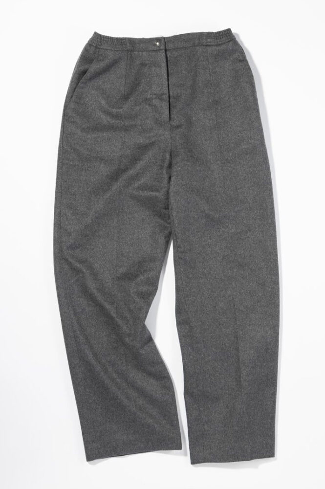 カジュアルスタイルの中でも、やや綺麗めのコーディネイトで重宝するグレーのスラックス のパンツ。「実はデザイン自体、ウィメンズのパンツなのですが、あまりの肌触りの良さに自分用として購入。カシミヤ製品でありながらもウォッシャブルなのも良いんです」