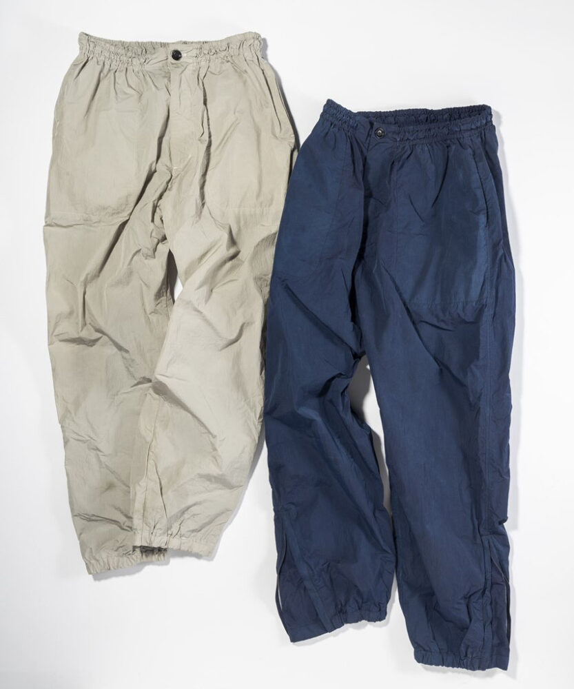 九州のモノづくりを背景にしウェアを展開するソウボウのトラックパンツ。「買うときに色を選ぶのが苦手で、すぐにカラバリで買ってしまうのですが、その悪癖が出るほど欲しかったパンツです」右/3万7400 円、左/3万1900円(ソウボウ http://sowbow.jp)