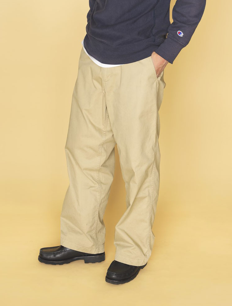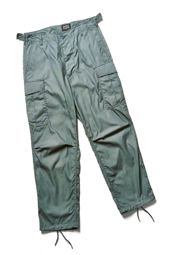 高密度に織り上げたコットンポプリンを使用したファティーグパンツは、太めのワタリに対して、裾に向けてややテーパードが施された穿いて美しいシルエットが特徴。「ヨーロッパとアメリカで流行したミリタリーパンツのディテールを融合させたデザイン。武骨になりすぎないシルエットとカラーはジャケットスタイルにも有効です」