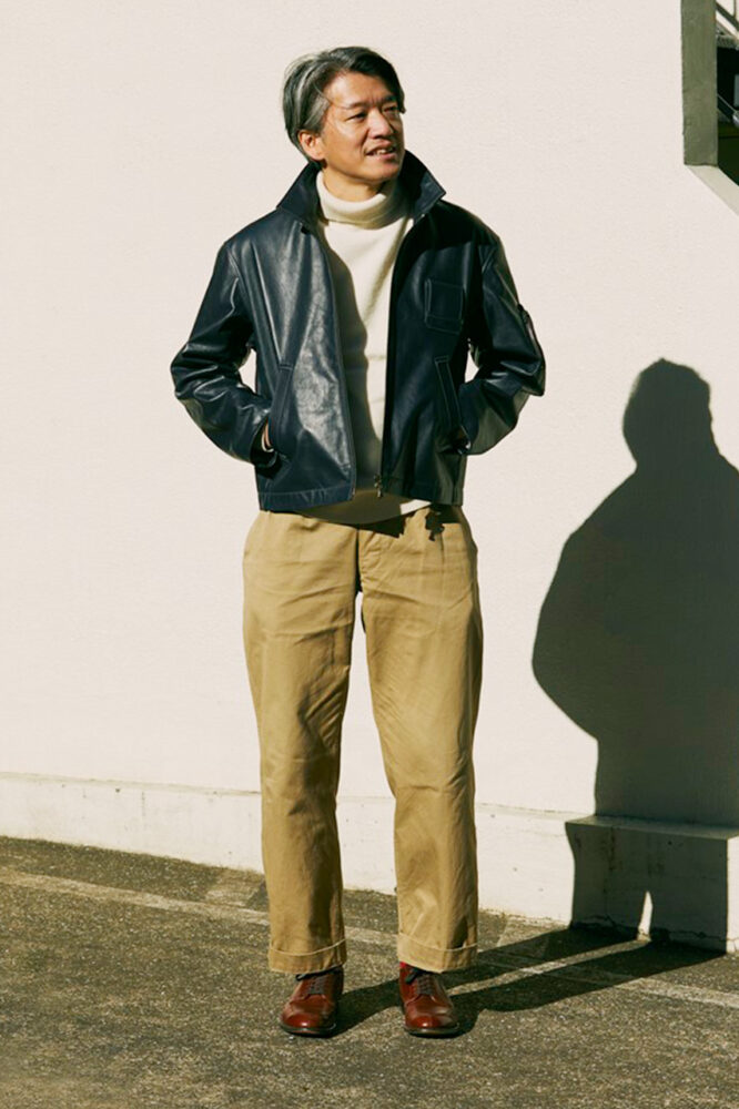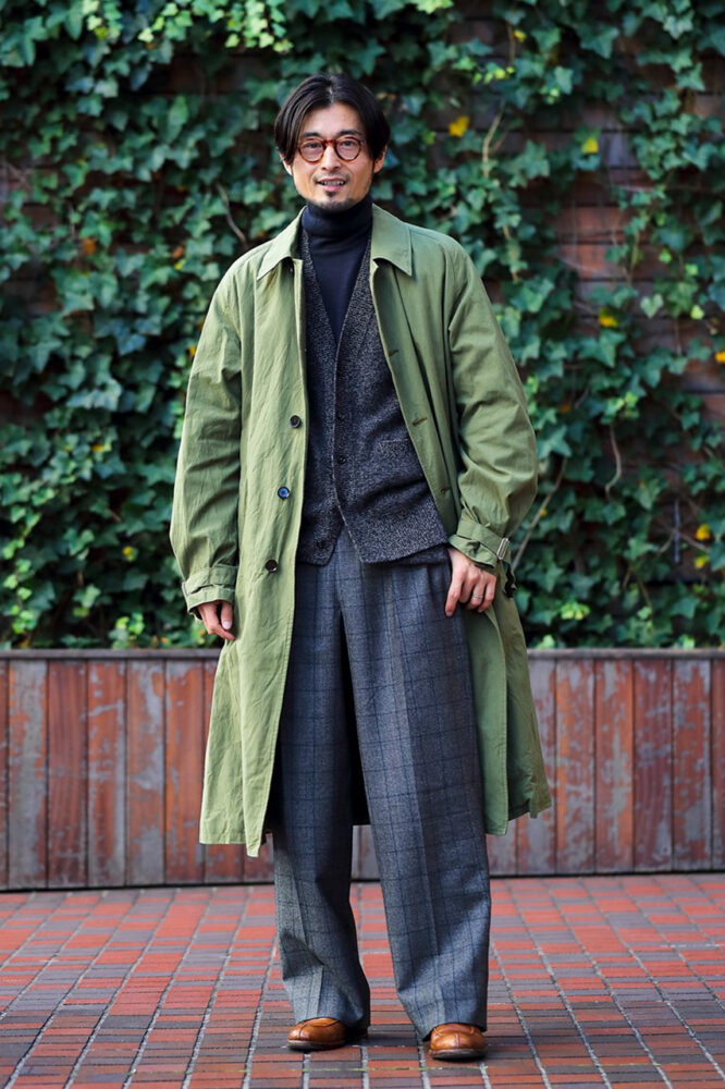 カジュアル過ぎず、ドレッシー過ぎない。柿本さんが着こなしで常に重視しているのはその“バランス”。「基本的にスラックスしか穿かないのは、上半身が割とカジュアルだからです。上をカッチリさせるときはデニムも穿きますよ」という具合にだ。今回はブルーム&ブランチの定番である仏軍のモーターサイクコートをメインとした着こなし。「ドレスに求められるルールは気にしていませんが、色合わせは大事にし、着崩し過ぎないように意識しています」