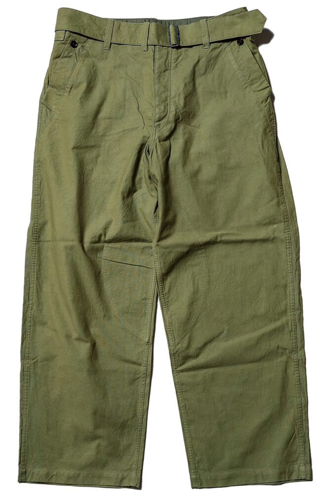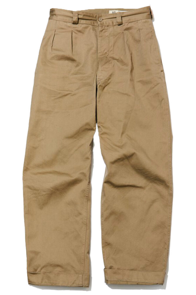 仏軍の名作チノパン。米軍のものに比べて腰回りがすっきりとし、洗練されたシルエットになっている。「足元にロングホーズソックスとオールデンを合わせて、ミリタリー&トラッドを表現しています」