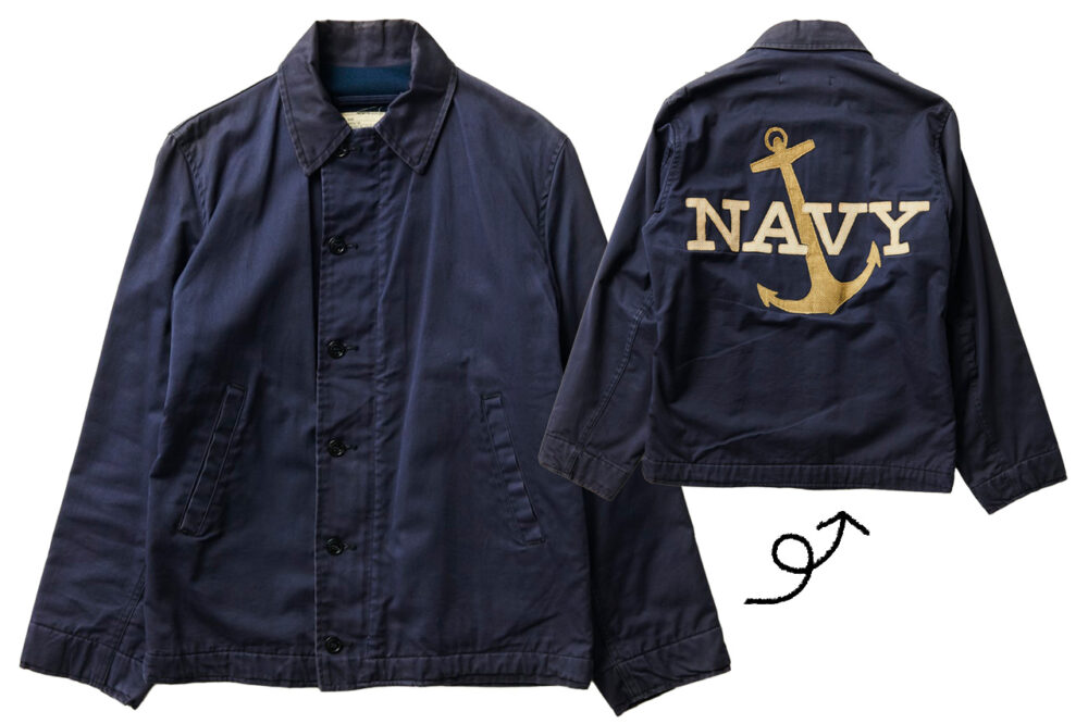 寺本さんが着用したのは、1970年代のUSネイビーのユーティリティジャケット。デッキワーカーを始め、様々な任務でワークウエア的な役割を果たしていた。「デザインは言わずもがな、この個体の見どころは背面の刺繍。麻袋で 使われているようなファブリックをパッチワークしており、US NAVYのシンボルマークであるイカリをモチーフにした大胆さも見事だ」