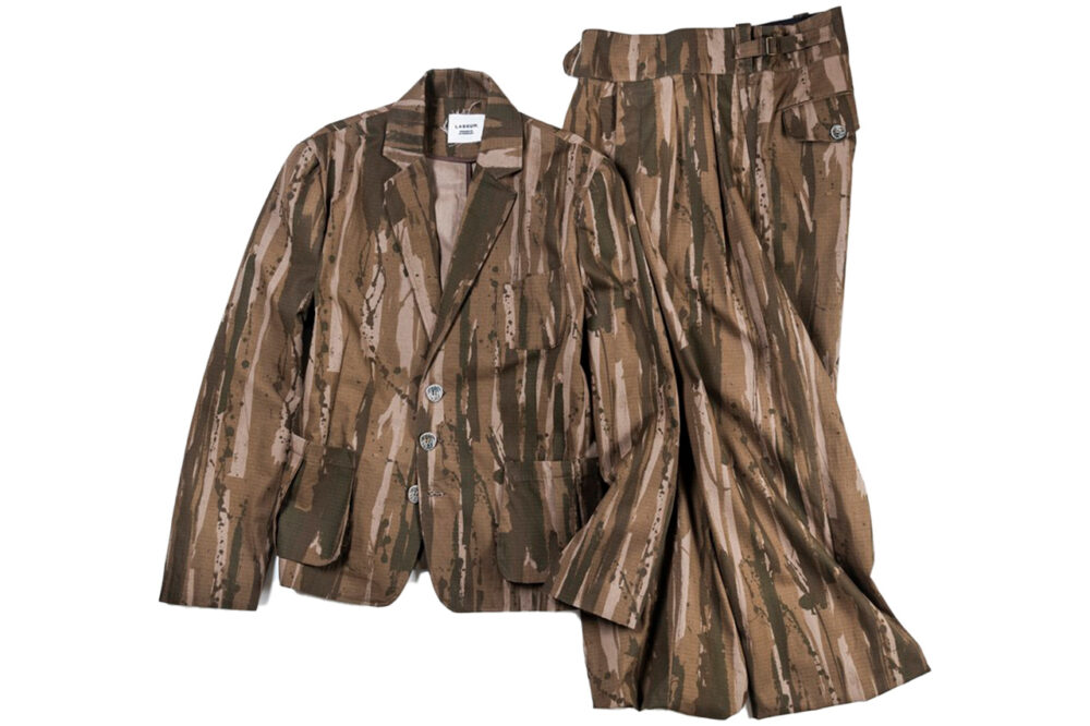 ディッピング技法などで独自のツリーカモを表現。リップストップ生地で遊びの効いたセットアップ。ジャケット9万2400円、パンツ6万4900円/ラブラムロンドン(エスディーアイ 03-6185-9331)