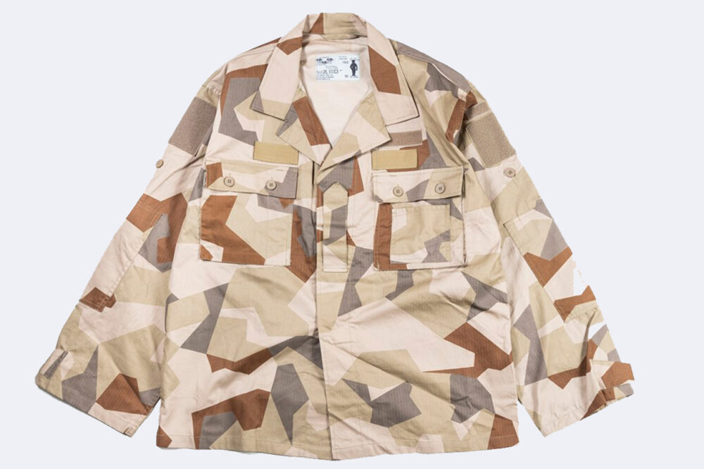 幾何学模様が多いスウェーデン軍の迷彩柄でも、とくにデザイン性が高い通称スプリンターカモ。砂漠地帯での着用を目的としたM90Kパターンを採用。9680円/エーエルイー(ワイパー 092-791-5252)