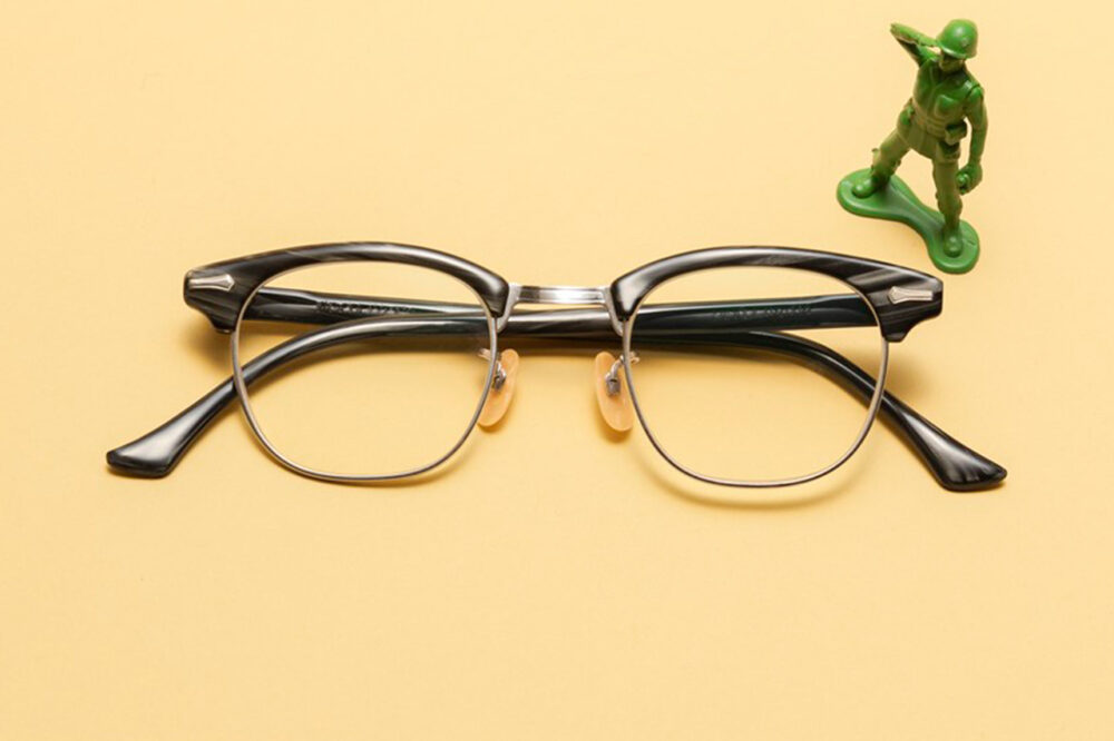 ツーブリッジに比べ、より一般的なアイウエアデザインとして浸透しているサーモント。フロント上部のみプラスチック、ブリッジと下リムはメタルになっており、シュロンやアメリカンオプティカルなどの米国メーカーがその原型を作ったとされている。確かな文献は残っていないが、その起源には実におもしろい ストーリーがある。かつてアメリカ軍にモント氏という人 物がいた。彼は将校という立場にいながら、眉毛が薄く威 厳がないことを悩んでいた。 そこで、アイウエアメーカーに頼んで眉毛を厚く見せるこ とのできる眼鏡を作らせたのが始まり。彼の名前からとってサー( sir、将校の意)、 モントと呼ばれるようになったのだとか。