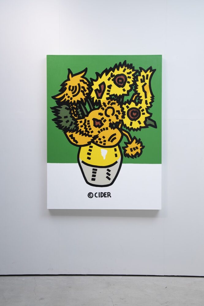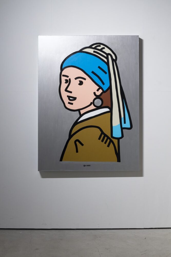 自分のライブのフライヤーや、2001年から『ハグトン』というマンガを描いていましたが、2005年にカフェでのイラスト展示を依頼されたのをキッカケに、せっかくだからハグトンをキャンバスに描いてみようって。それがなんだかんだで売れて、200枚は描いたかな? もう死ぬほど描いて飽きたというか、やり尽くしたなって。 そこで試しに名画を模写して みようと思ったんです。ゴッホの絵をディック・ブルーナ(ミッフィーで知られるオラン ダの絵本作家)のように色数を減らして線を単純化してみたのをキッカケに、名画シリーズが誕生しました。最初は、ふざけて贋作シリーズなんて呼んでいましたが、要は遊びですよね。ラップも遊びの延長線上でしたし。