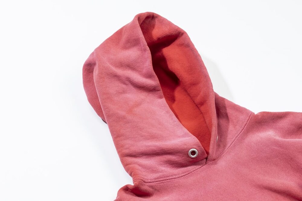 中央のスウェットパーカのフード部分に寄ってみると分かるが、フード裏側はそこまで経年していない。どれだけの色落ちを遂げているかが一目瞭然だ。